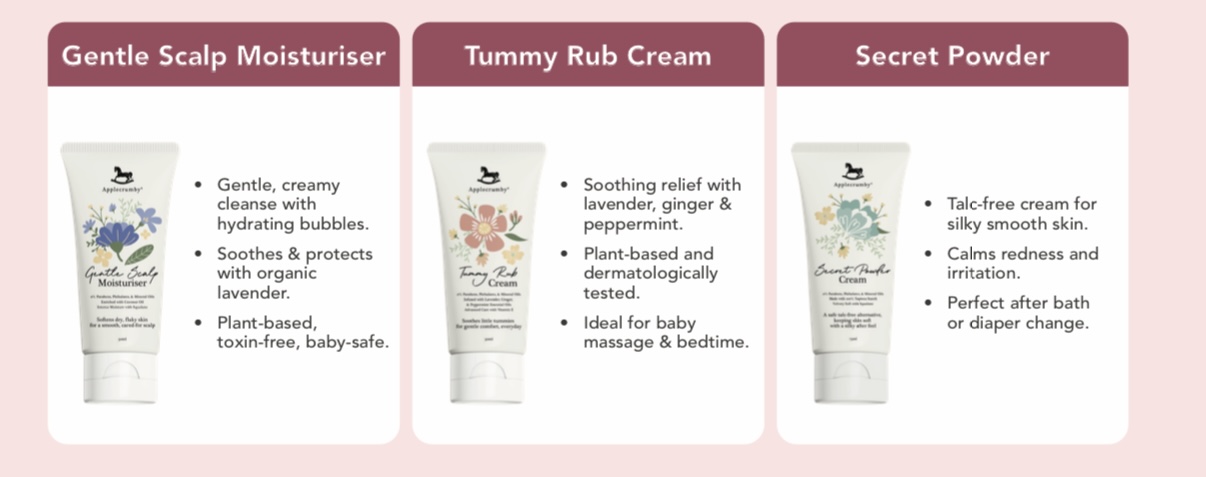 Dirumus khas dengan bahan yang lembut dan selamat untuk kulit, rangkaian penjagaan kulit ini mengekalkan prinsip teras Applecrumby® yang mengutamakan kelembutan, keselamatan dan ketenangan minda ibu bapa, sejajar dengan komitmen jangka panjangnya dalam menyokong kesejahteraan kanak-kanak.