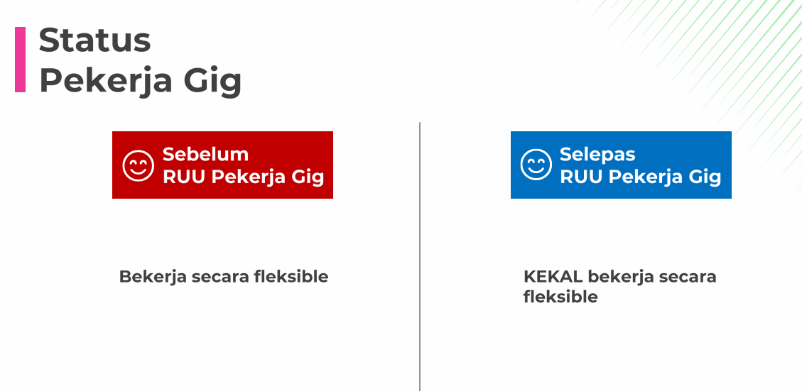 Namun, selepas RUU ini diluluskan, pekerja gig diiktiraf secara rasmi sebagai warganegara atau penduduk tetap yang menjalankan perkhidmatan melalui perjanjian kontrak dengan entiti tertentu dan menerima pendapatan daripada perkhidmatan yang diberikan.