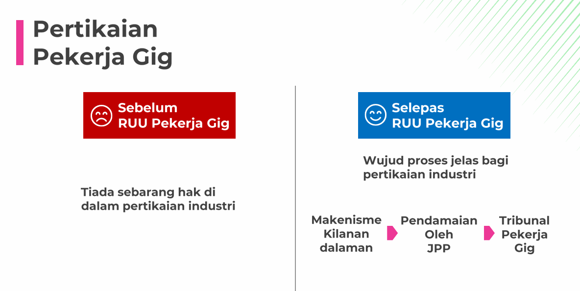 Menerusi RUU ini, memperkenalkan proses penyelesaian yang lebih jelas melalui Mekanisme Kilanan (aduan dalaman), Pendamaian oleh Jabatan Perhubungan Perusahaan (JPP) dan seterusnya Tribunal Pekerja Gig bagi menyelesaikan kes dengan lebih adil.