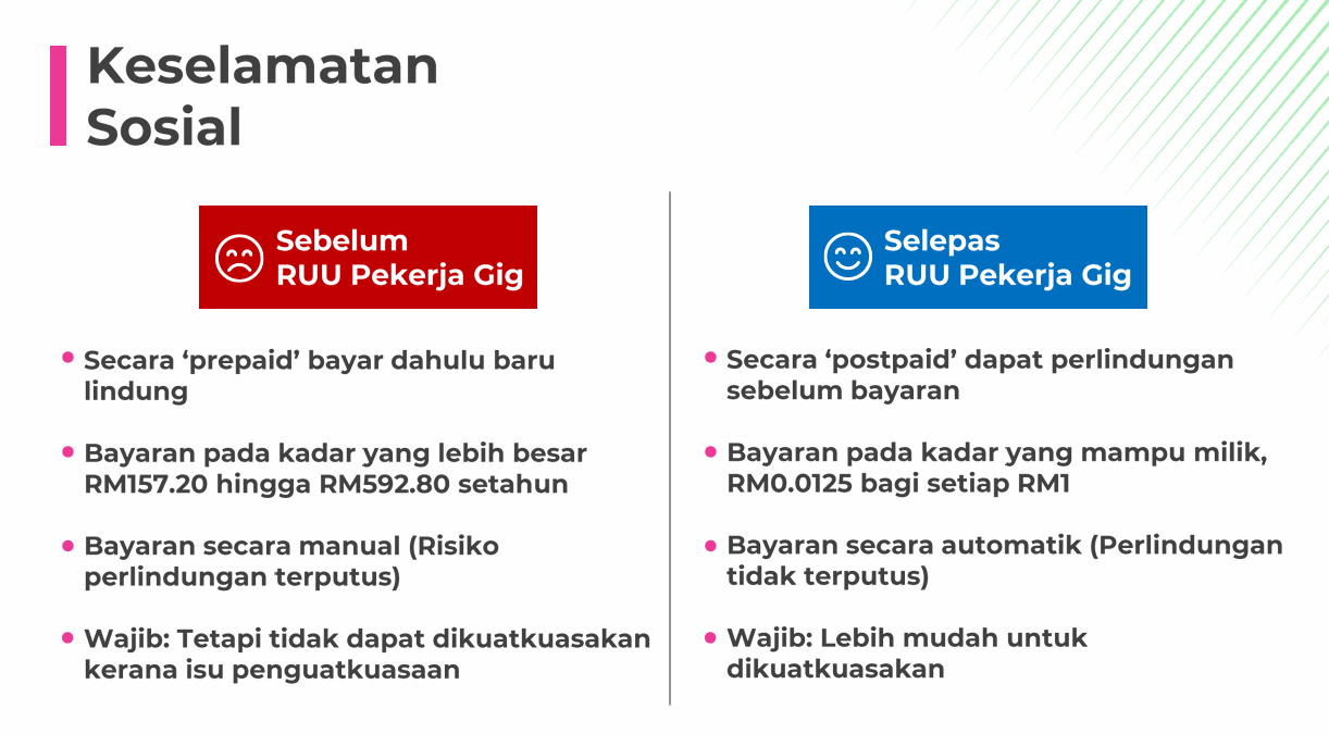 Dengan adanya RUU Pekerja GIG ini, rakyat yang berkhidmat di bawah sektor ini bakal menerima pelbagai manfaat.