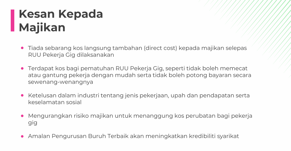 Antaranya tiada sebarang kos langsung tambahan yang perlu ditanggung selepas pelaksanaannya; kos pematuhan RUU Pekerja Gig seperti tidak boleh memecat atau menggantung pekerja dengan mudah serta tidak boleh memotong bayaran sesuka hati.