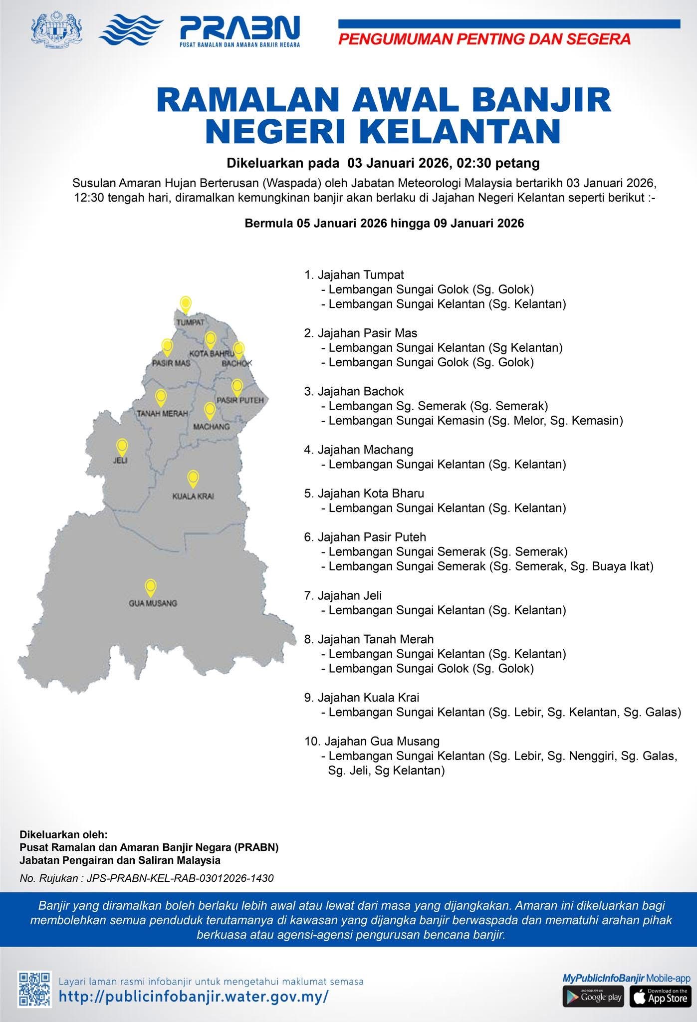 Di Kelantan, 10 jajahan disenaraikan bakal dilanda banjir bermula 5 Januari 2026 hingga 9 Januari 2026.
