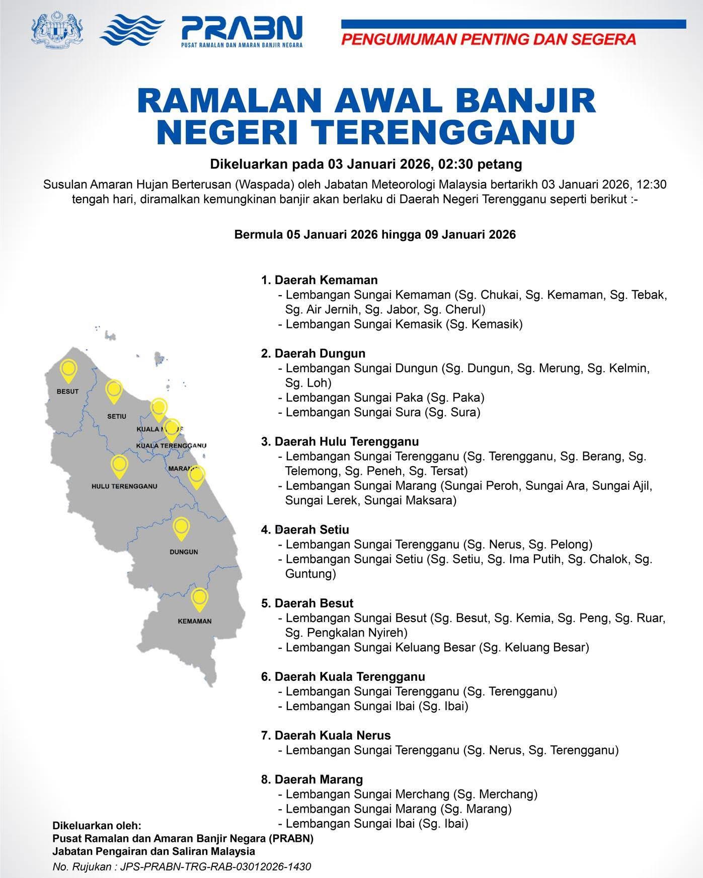 Jabatan Pengairan dan Saliran Malaysia menerusi Pusat Ramalan dan Amaran Banjir Negara (PRABN) mengeluarkan ramalan awal banjir melibatkan Kelantan, Terengganu dan Pahang yang berkemungkinan bermula seawal 5 hingga 9 Januari depan.