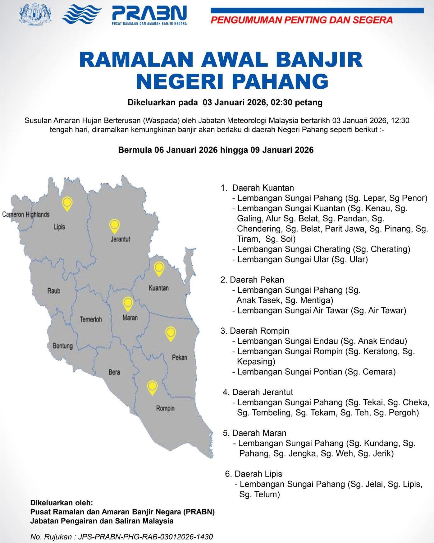 Ramalan awal banjir di Pahang yang dikeluarkan PRABN menyenaraikan enam daerah bakal terlibat.